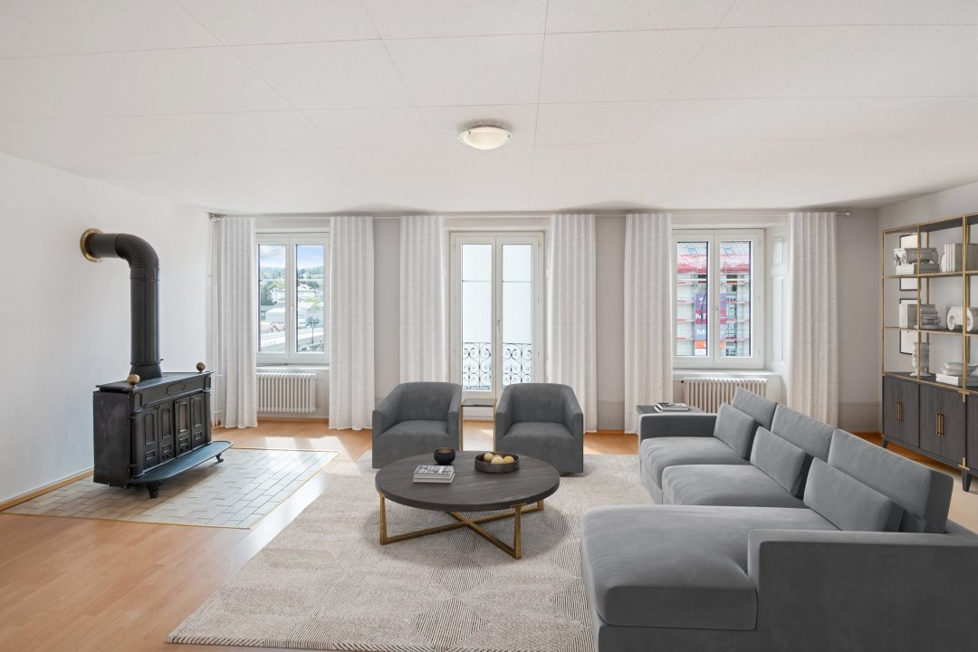 Appartement en duplex composé au 4ème : vestibule, séjour avec poêle, cuisine agencée, W.C. séparé et au 5ème : 3 chambres, salle de bains-WC. Le matériel pour la réfection de peinture et offert.