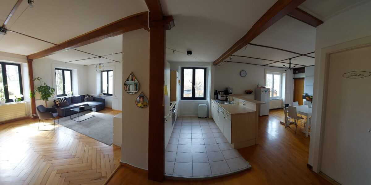 3,5 pièces, avec parquet et poutres apparentes dans un petit immeuble de 3 logements en pleine nature composé comme suit :
